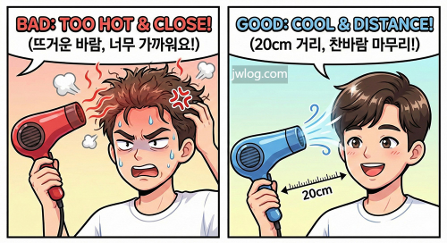 요약하자면, "타월로 충분히 물기 제거 → 20cm 거리에서 미지근한 바람으로 두피 건조 → 찬 바람으로 마무리하며 두피 열 내리기". 이 3단계 공식만 기억하신다면, 열 손상 없이 건강한 두피와 풍성한 볼륨을 지키실 수 있을 것입니다.